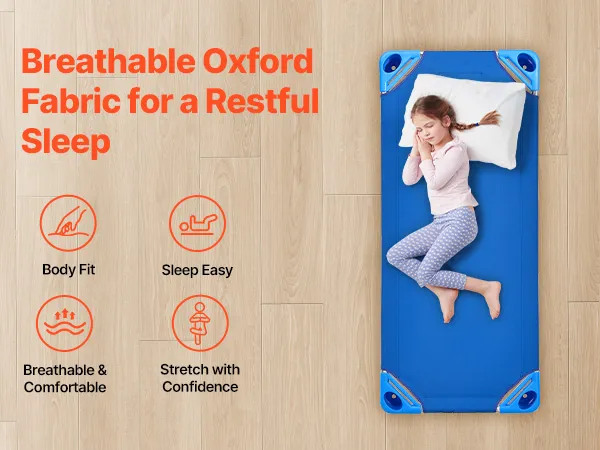 Comfortabel en ademend: kinderen kunnen zich uitstrekken op de duurzame Oxford-stof en de perfecte slaaphouding vinden. Het ademende materiaal en de 15 cm hoge pootjes zorgen ervoor dat de lucht eronder goed kan circuleren, waardoor het bedje schoon blijft en niet op de grond staat. Dit zorgt voor een koelere, hygiënischere plek voor kinderen om te ontspannen en een dutje te doen