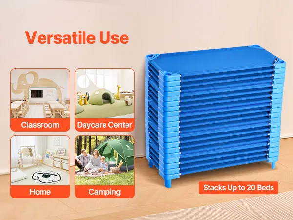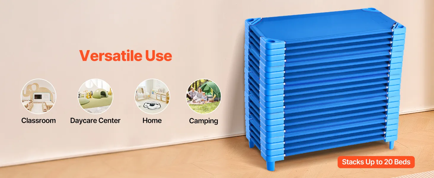 Stapelbaar en ruimtebesparend: Deze stapelbare kinderbedden zijn ontworpen om verticaal te worden gestapeld, waardoor u tot wel 20 bedden in een kleine ruimte kunt plaatsen. Ze kunnen gemakkelijk worden losgemaakt als het tijd is voor een dutje en de afgeronde hoeken zorgen ervoor dat ze gemakkelijk kunnen worden opgetild en snel kunnen worden opgezet, waardoor het dutje snel en efficiënt verloopt voor kinderen en verzorgers.