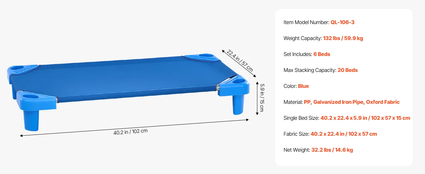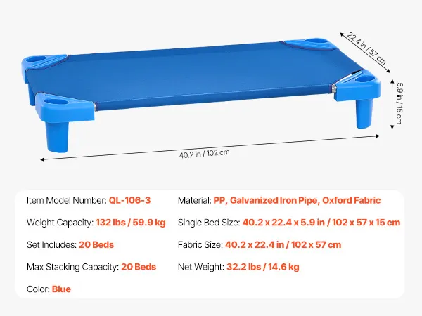 Deze stapelbare bedden hebben een stevig gegalvaniseerd stalen frame en afgeronde PP-hoeken en zijn ontworpen om uw kleintjes veilig te houden tijdens hun dutje. Maak je geen zorgen, dit bed is gemaakt om eeuwig mee te gaan!