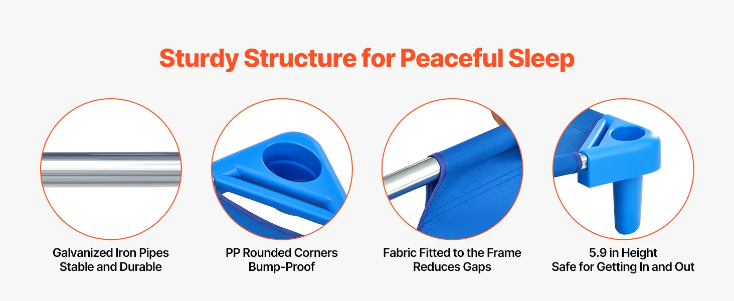 Duurzaam en veilig voor kinderen: de sterke PP-hoeken zijn stevig en breken niet snel, terwijl het stevige stalen frame tot 59,9 kg kan dragen - genoeg voor opgroeiende kinderen. Deze stapelbare dwarsliggers voldoen aan de CPSIA-normen en hebben afgeronde randen voor extra geluidsisolatie. De nauwsluitende Oxford-stof beschermt kleine handjes en voetjes tijdens het rusten, zodat uw kinderen comfortabel kunnen slapen