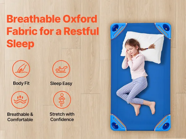 Comfortabel en ademend: kinderen kunnen zich uitstrekken op de duurzame Oxford-stof en de perfecte slaaphouding vinden. Het ademende materiaal en de 15 cm hoge poten zorgen ervoor dat de lucht eronder goed kan circuleren, waardoor het bedje schoon blijft en niet op de grond terechtkomt. Dit zorgt voor een koelere, hygiënischere plek voor kinderen om te ontspannen en een dutje te doen