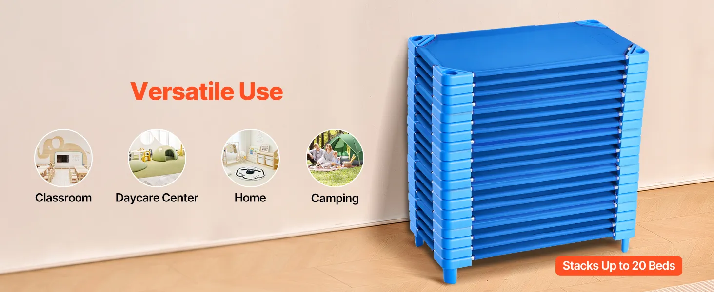 Stapelbaar en ruimtebesparend: Deze stapelbare kinderbedden zijn ontworpen om verticaal te worden gestapeld, waardoor u tot wel 20 bedden in een kleine ruimte kunt plaatsen. Ze kunnen gemakkelijk worden losgemaakt als het tijd is voor een dutje en de afgeronde hoeken zorgen ervoor dat ze gemakkelijk kunnen worden opgetild en snel kunnen worden opgezet, waardoor het dutje snel en efficiënt verloopt voor kinderen en verzorgers.