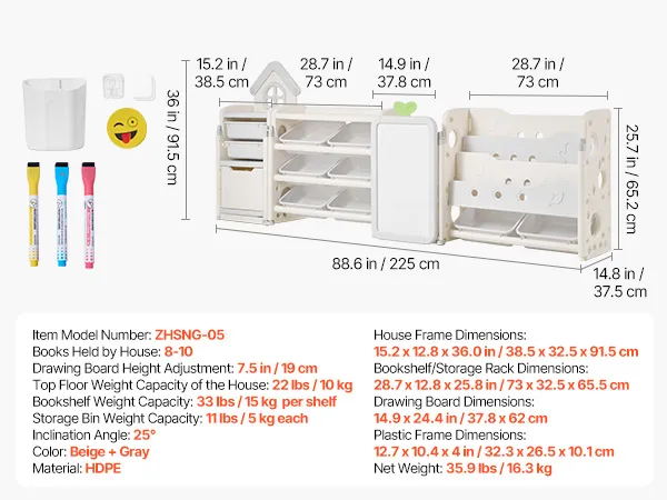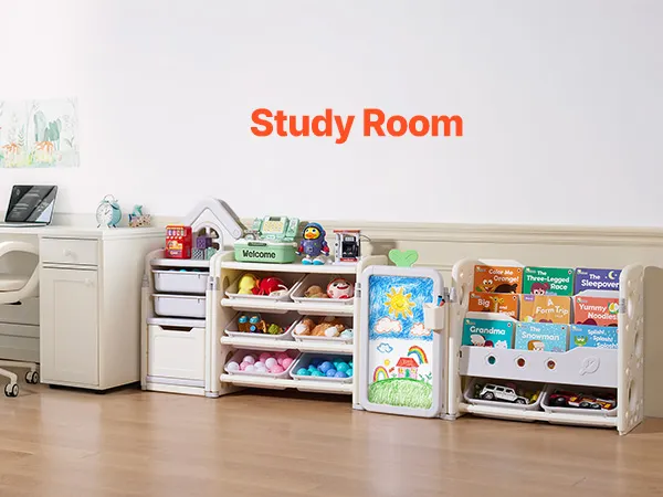 Open speelruimte: De open opbergvakken zijn geplaatst in schuine, antislipgroeven, waardoor kinderen gemakkelijk hun favoriete speelgoed kunnen vinden. De open boekenplank biedt plaats aan maximaal 30 boeken en de juiste hoogte zorgt ervoor dat kinderen er ongehinderd bij kunnen en kunnen lezen. De verstelbare tekentafel stimuleert de verbeelding en creativiteit van kinderen.