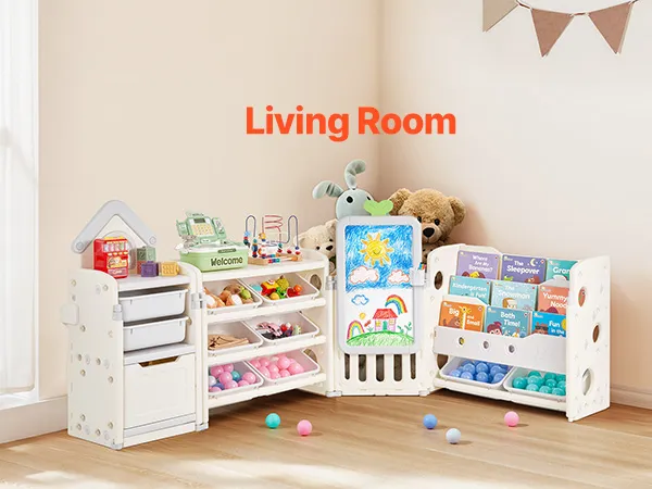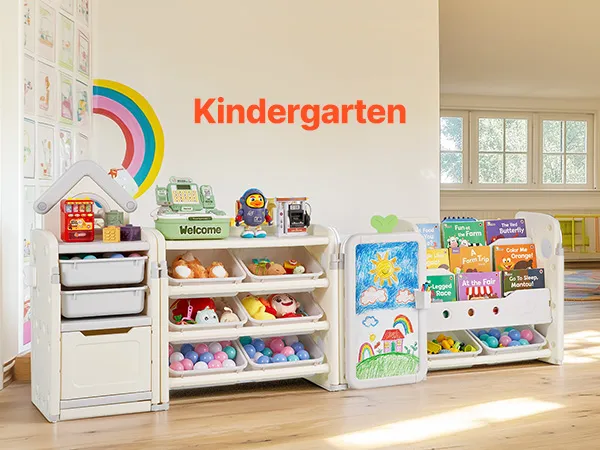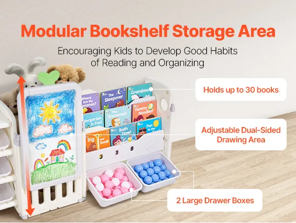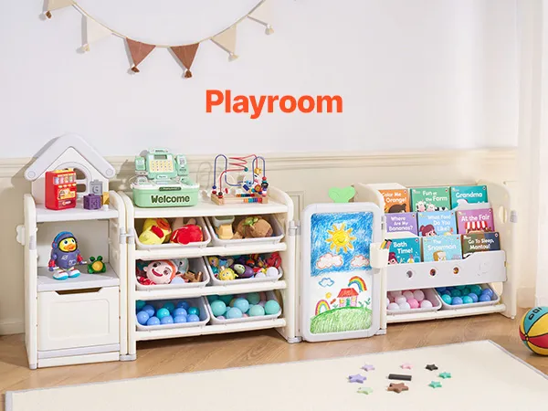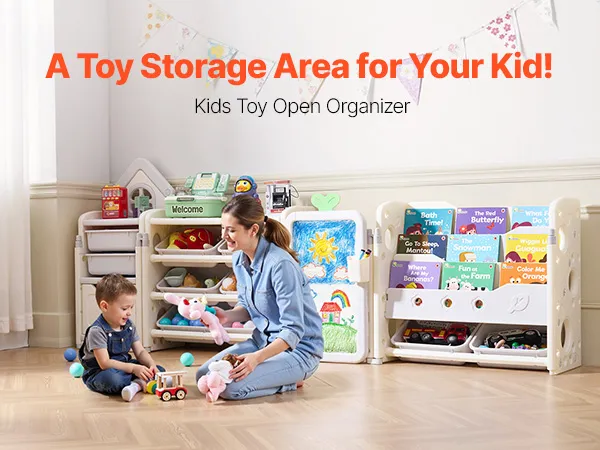 Multifunctionele opbergruimte: Deze speelgoedorganizer voor kinderen combineert een speelgoeddisplay, boekenplanken, opbergruimte, tekenruimte en poppenopbergruimte, en biedt volop ruimte voor speelgoed, boeken, schrijfwaren, bouwstenen en meer. Dankzij het ruime, gecompartimenteerde ontwerp houdt hij de kamer georganiseerd en kunnen kinderen het plezier van opbergen ervaren.