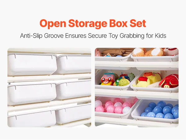 De open opbergbakken zitten in schuin aflopende, antislip groeven, zodat kinderen hun favoriete speelgoed goed kunnen zien en de bakken toch stevig op hun plaats blijven.