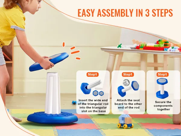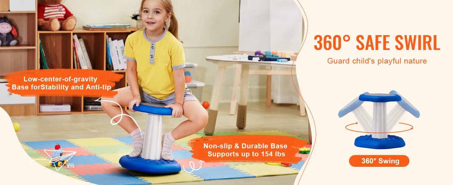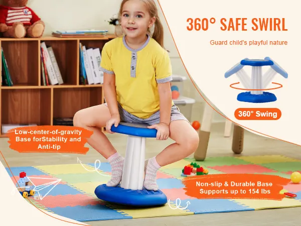 The 360° swinging motion aligns with children's playful nature. The non-slip base enhances traction, preventing slips during play, while the textured footrest improves blood circulation. With a strong 154 lb weight capacity, it provides stability during spinning games.
