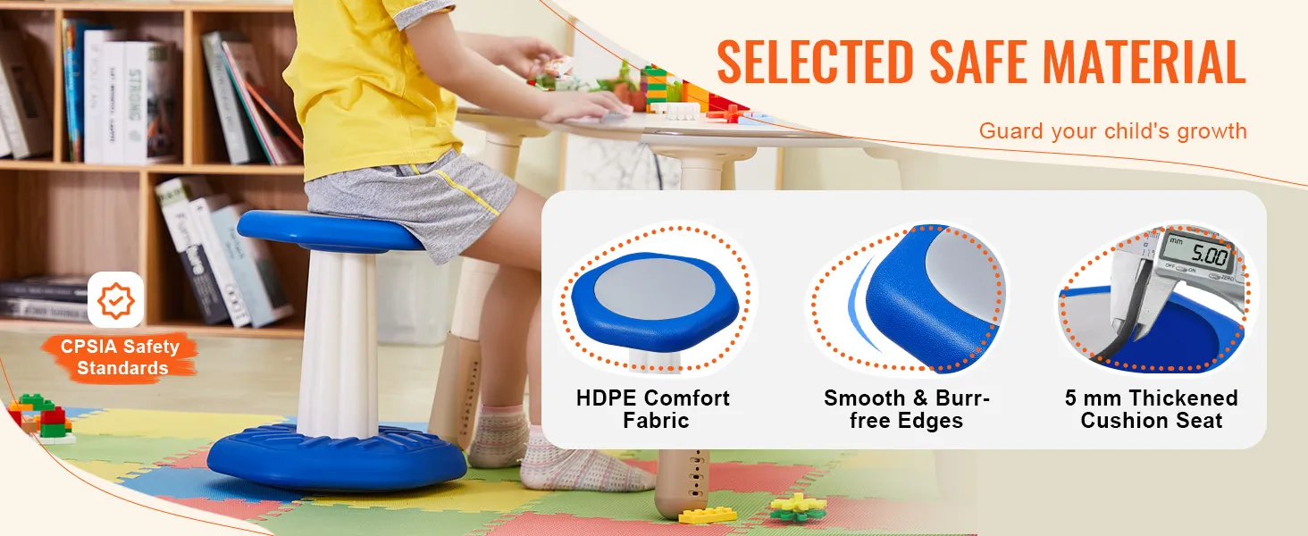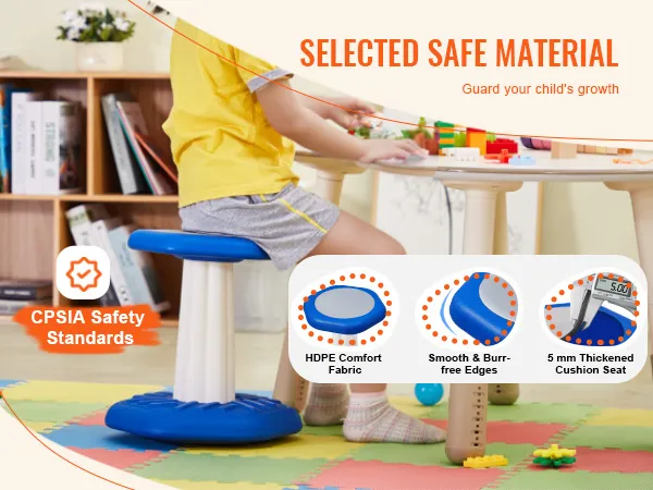 Built for Safety: Your child's safety is our top priority. Made from high-quality, CPSIA-certified HDPE material, this wobble stool features smooth, burr-free edges to prevent bumps and injuries. The 5mm thickened seat cushion ensures maximum comfort for long sitting sessions.