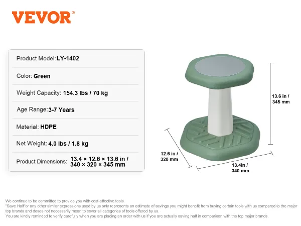 VEVOR Kids Wobble Chair Active Chair with Sponge Cushion, Wobble Stool Improves Focus, Posture and Calm Children, Ideal for Schools and Preschools, Age 3-7, Green