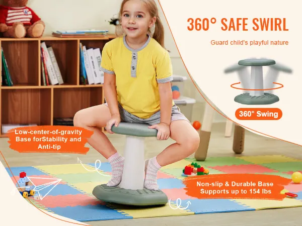 The 360° swinging motion aligns with children's playful nature. The non-slip base enhances traction, preventing slips during play, while the textured footrest improves blood circulation. With a strong 154 lb weight capacity, it provides stability during spinning games.