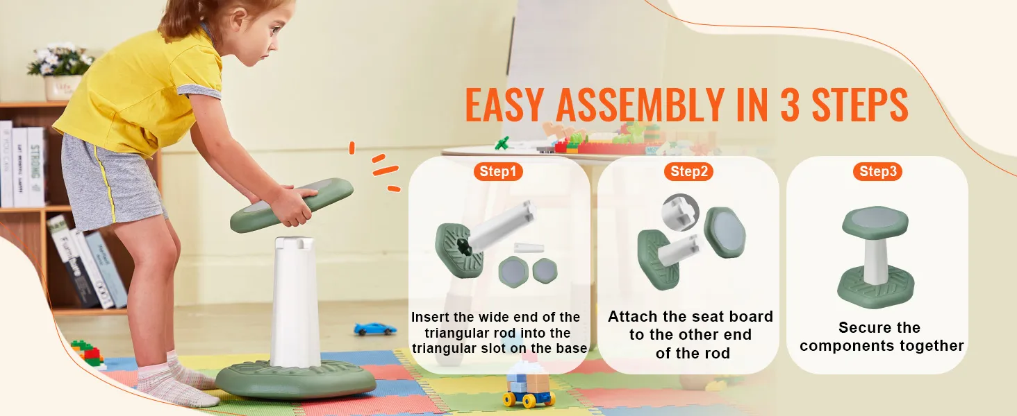 Easy to Assemble & Move: Assembling this kids wobble chair takes just three simple steps, reducing the hassle of traditional classroom seating. Its ergonomic design and lightweight build allow kids to move it themselves, encouraging more movement throughout the day and making sitting more appealing.