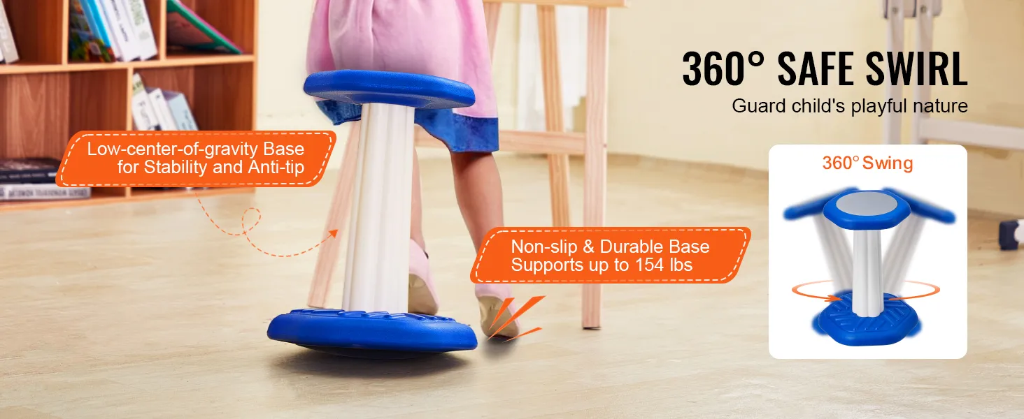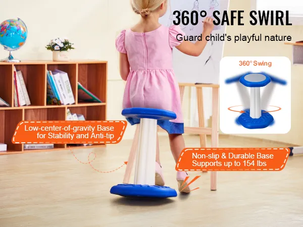 The 360° swinging motion aligns with children's playful nature. The non-slip base enhances traction, preventing slips during play, while the textured footrest improves blood circulation. With a strong 154 lb weight capacity, it provides stability during spinning games.