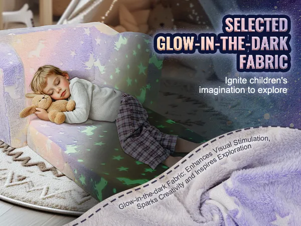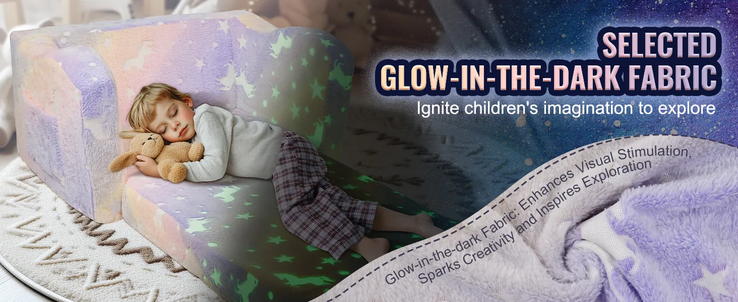 Verbeelding stimuleren: De peuterstoel is voorzien van glow-in-the-dark stof die overdag licht absorbeert en weer vrijgeeft als het donker wordt. Dit creatieve ontwerp in combinatie met de glow-in-the-dark deken stimuleert de nieuwsgierigheid en ontdekkingsdrang van kinderen en maakt de vouwbank tot een echte eyecatcher.
