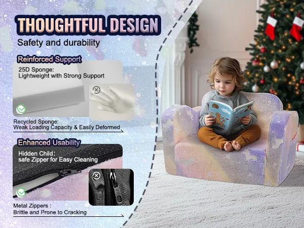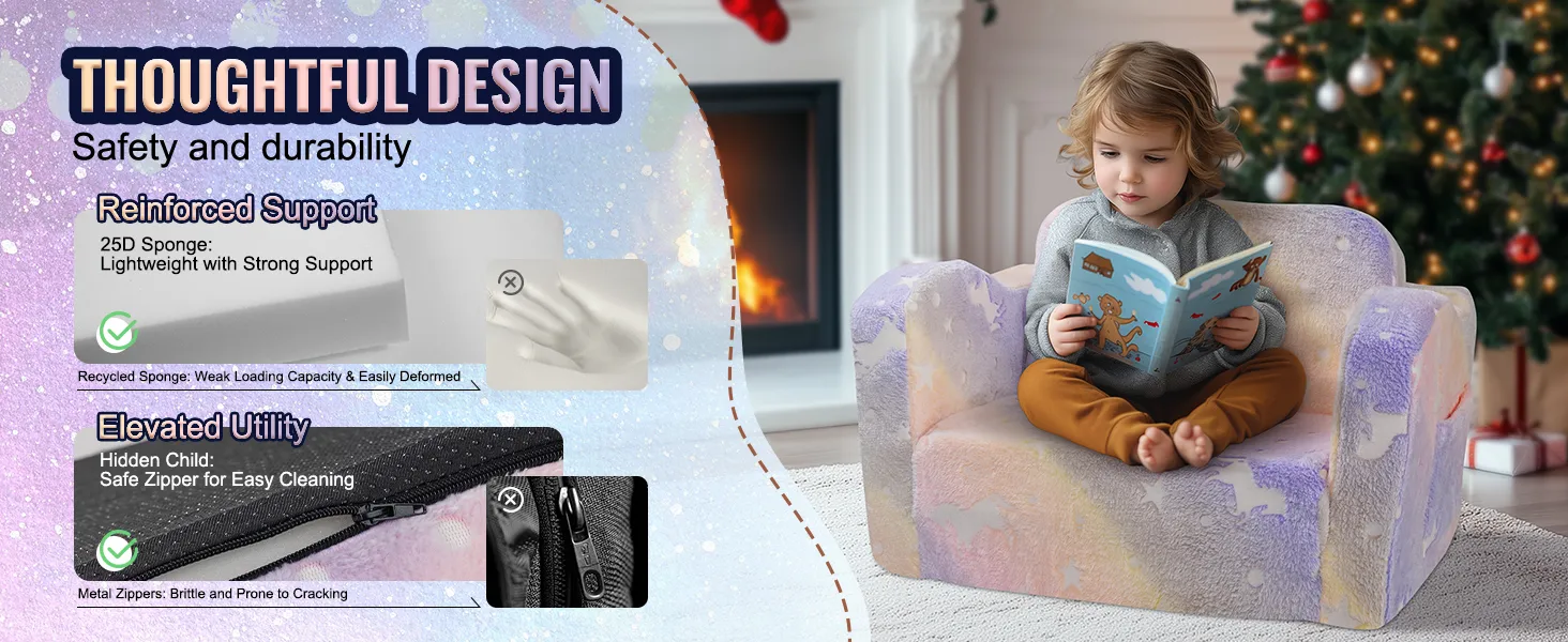 We gebruiken een zachte, huidvriendelijke en vervuilingsvrije suède stof, terwijl de bank gevuld is met hoogwaardig 25D-schuim dat kinderen veiligheid en comfort biedt.