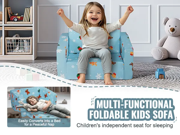Fantasierijk: De peuterstoel is bekleed met een stof die oplicht in het donker, overdag licht absorbeert en in het donker weer vrijgeeft. Dit creatieve ontwerp in combinatie met de glow-in-the-dark deken stimuleert de nieuwsgierigheid en ontdekkingstocht van kinderen en maakt het opvouwen van de peutersofa nog leuker.