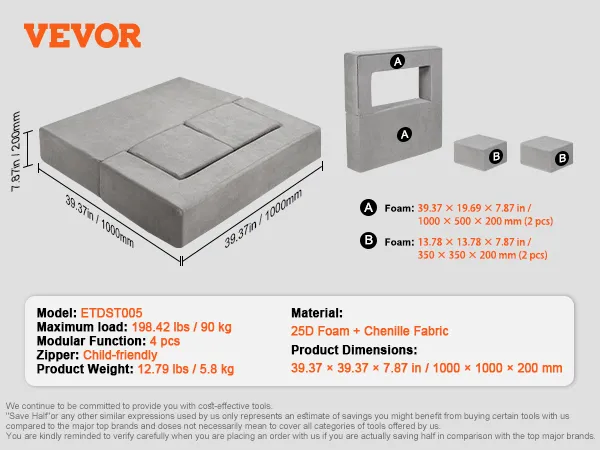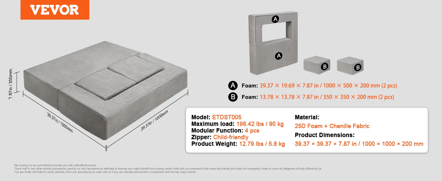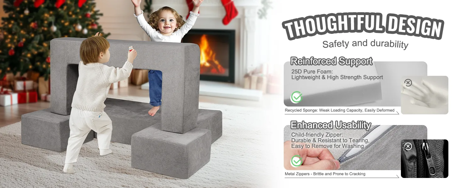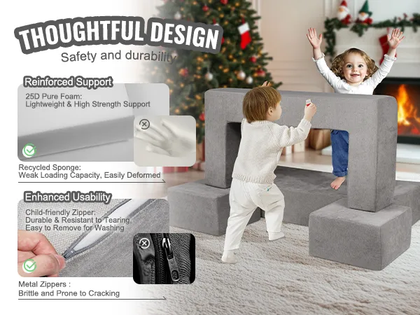 Twee belangrijke ontwerpverbeteringen: De kinderbouwplaats is gemaakt van lichtgewicht maar zeer dichte 25D-spons, die uitstekende grip biedt, waardoor het voor kinderen gemakkelijker wordt om te hanteren tijdens het spelen. Om veiligheidsredenen hebben we hoogwaardige ritssluitingen gebruikt die duurzaam en scheurbestendig zijn en onbedoeld inslikken voorkomen.