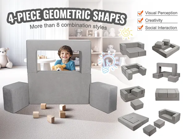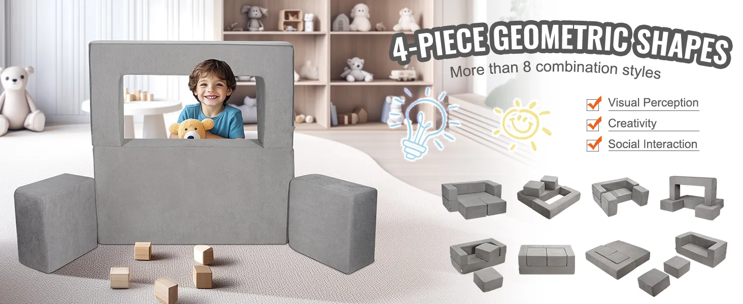 Deze hoogwaardige kinderspeelbank is gemaakt van zacht suède en 25D spons en voldoet aan de CPC-normen en het HCN-veiligheidscertificaat. Met de verschillende geometrische elementen kunnen kinderen talloze combinaties creëren om hun fantasie te stimuleren.