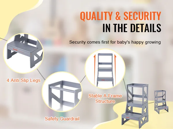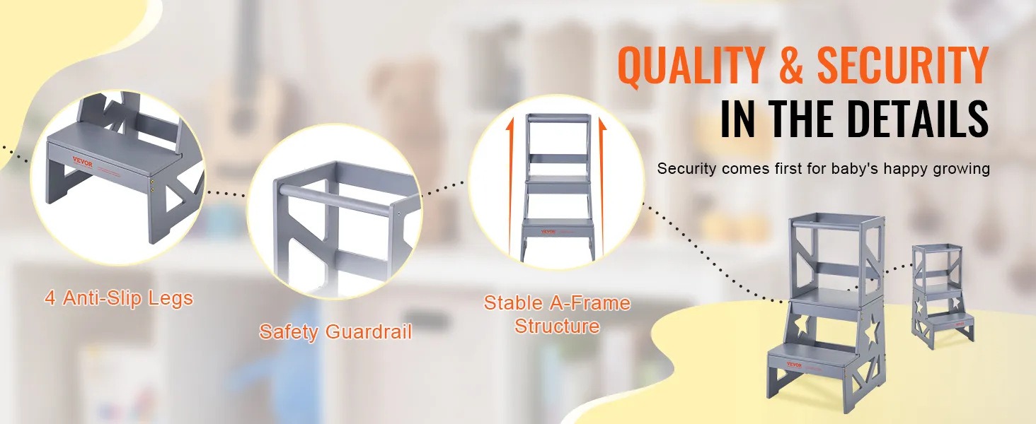 Vertrouw op onze staande toren voor peuters voor een veilige en comfortabele ervaring. Uitgerust met veiligheidsrails voor extra veiligheid van het frame, een stevige “A”-structuur voor stabiliteit en antislippoten om omvallen te voorkomen, kan uw kind met een gerust hart op ontdekkingstocht gaan.