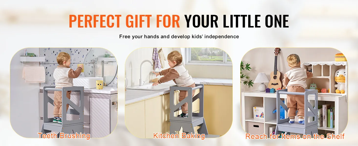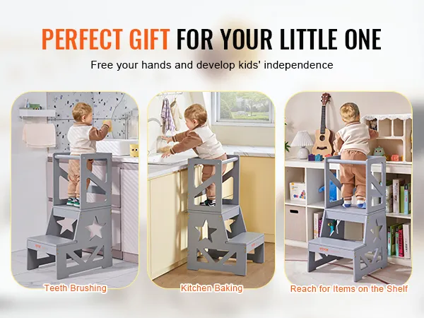 Het perfecte cadeau om de onafhankelijkheid te bevorderen! Geef uw kind de mogelijkheid om zelfstandig zijn tanden te poetsen, te koken en toegang te krijgen tot voorwerpen. Ons opstapje voor peuters geeft je handen de vrijheid en stimuleert de onafhankelijkheid van je kind, zodat het kan genieten van de reis van de groei.