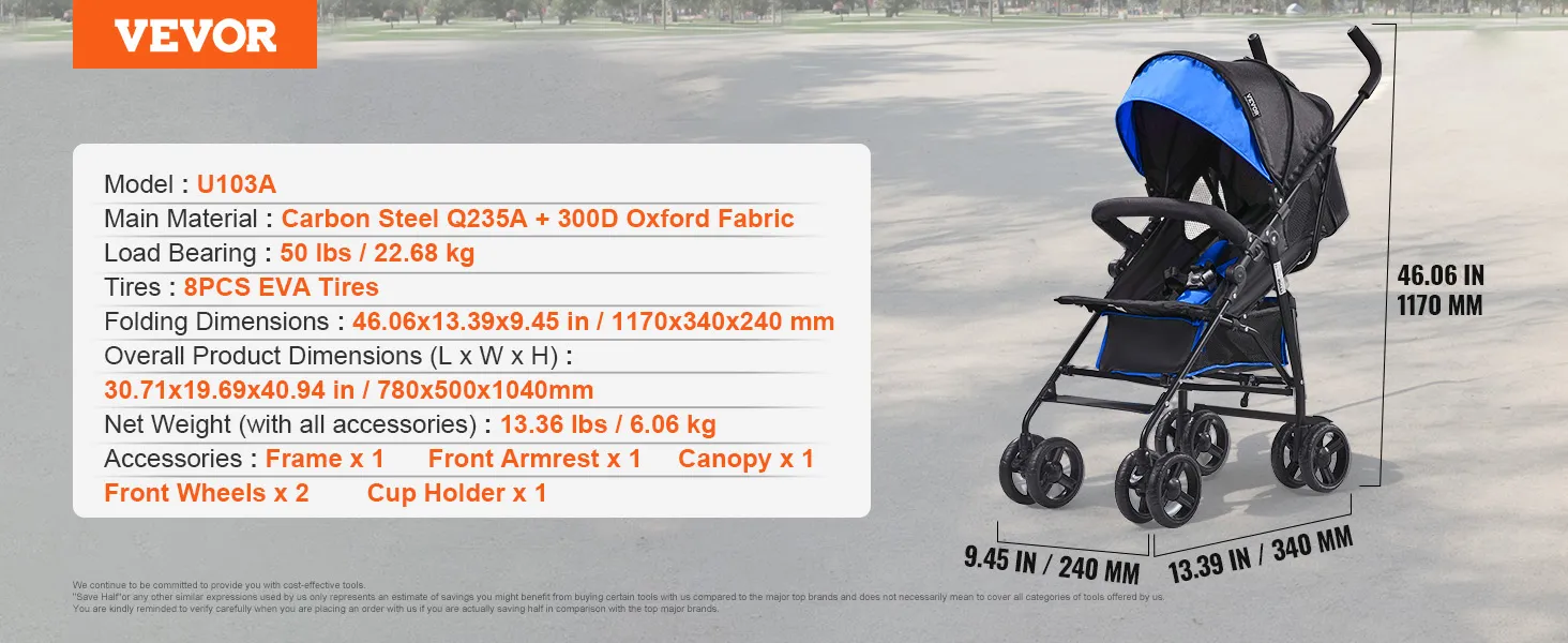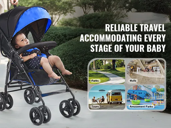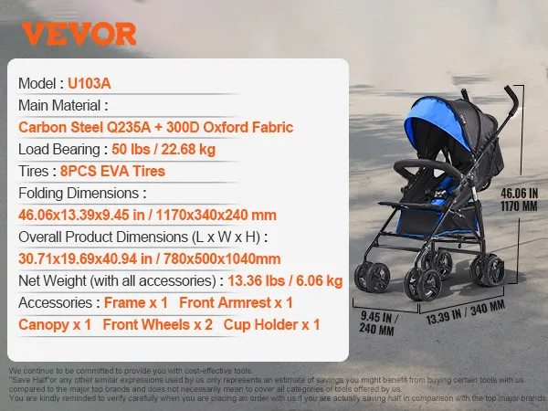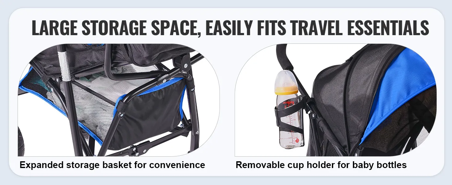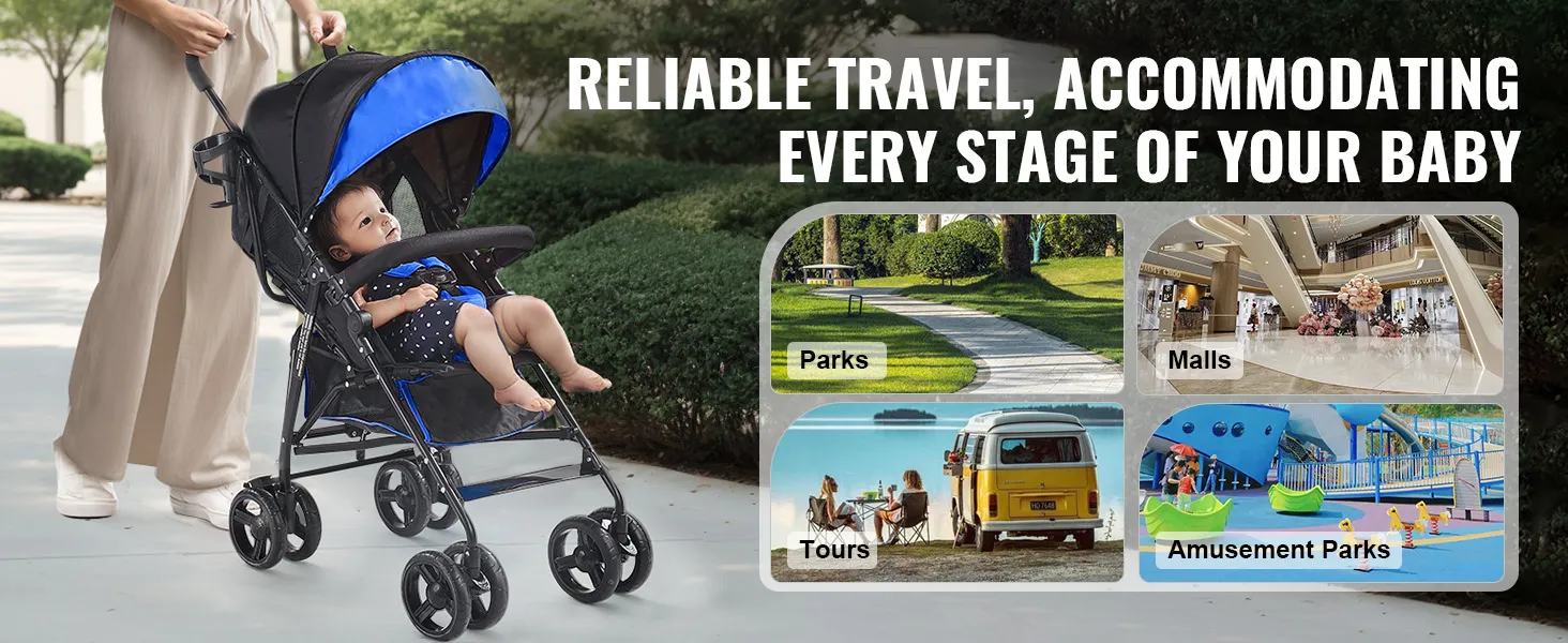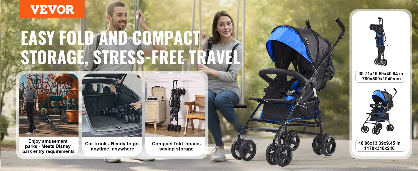VEVOR lichtgewicht kinderwagen, compact, eenvoudig opvouwbaar met verstelbare rugleuning, frame van koolstofstaal, grote opbergmand, paraplu-kinderwagen voor reizen en meer, zwart/blauw