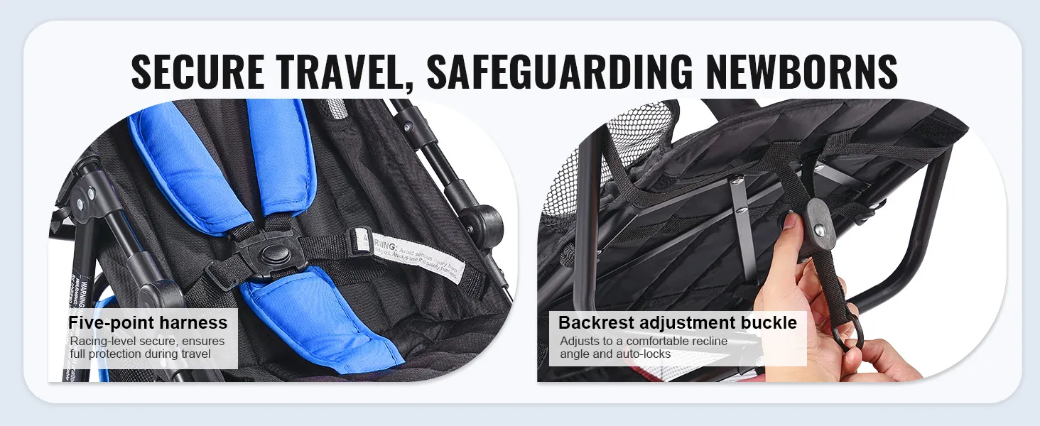 Elke stap van de reis van uw baby is cruciaal voor de veiligheid! Deze kinderwagen is voorzien van een 5-punts veiligheidsharnas voor raceveiligheid en zorgt voor volledige veiligheid voor uw baby. De gesp voor het verstellen van de rugleuning vergrendelt automatisch.
