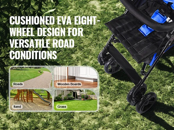 Hoog draagvermogen: deze kinderwagen met zijn stevige frame van koolstofstaal kan tot 15 kg dragen, waardoor hij geschikt is voor baby's van 6 maanden tot 3 jaar. Hij beschikt over acht zeer elastische EVA-banden met ingebouwde schokabsorptie om hobbelige wegen aan te pakken en een comfortabele rit te bieden.