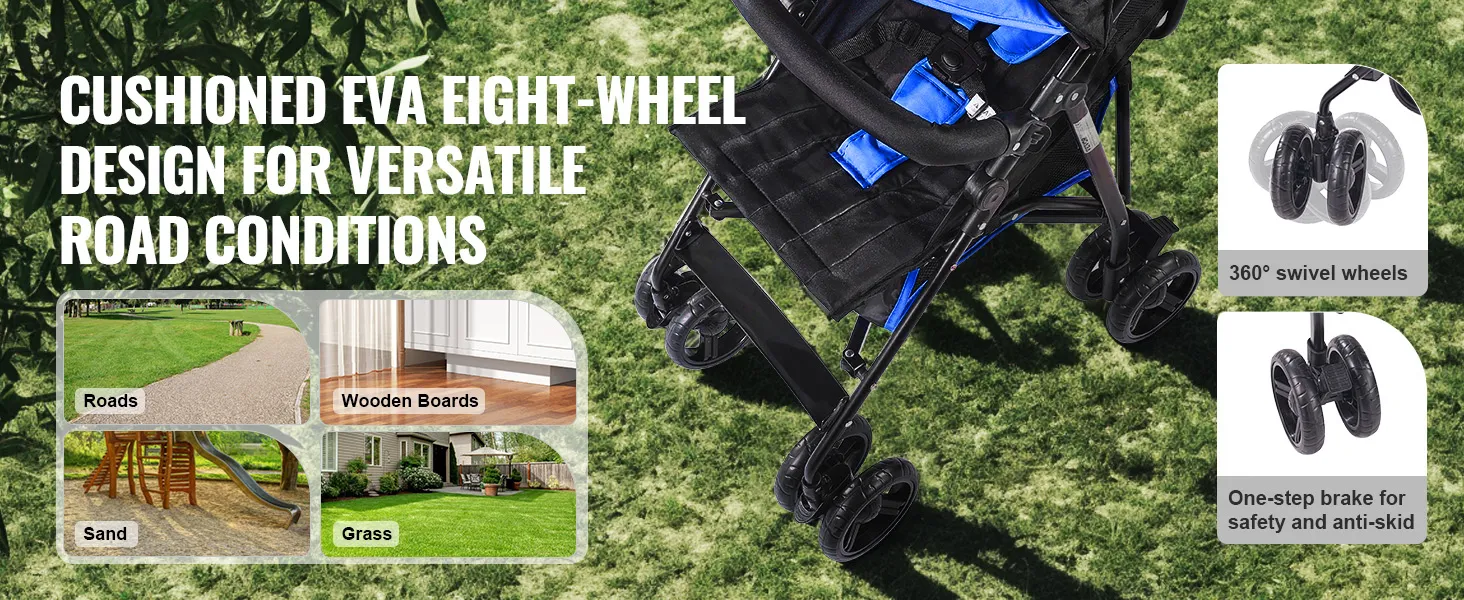 Uitgerust met acht schokabsorberende EVA-banden kan deze reisbuggy gemakkelijk verschillende ondergronden aan. Dankzij de 360° draaibare wielen kun je moeiteloos duwen en de voetbediende rem stopt onmiddellijk om wegrollen te voorkomen.