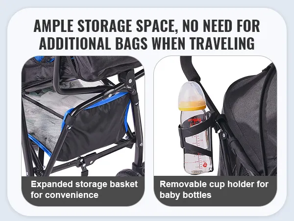De lichtgewicht kinderwagen heeft een grote opbergmand eronder en een afneembare bekerhouder naast het handvat. Het biedt comfortabel ruimte voor belangrijke spullen voor baby en ouders.