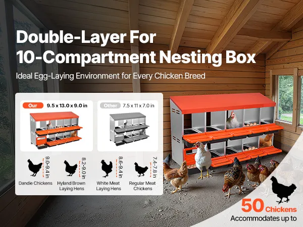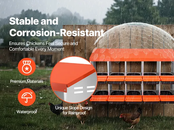 Sturdy & Comfortable: The nesting boxes are made of high-quality galvanized steel and strong, easy-to-clean plastic to ensure that they won't rust or wear out over long periods of use and in harsh weather conditions. Additionally, our spacious laying boxes feature a large room with a ventilated design to ensure fresh air circulation and keep the nesting environment dry and cool.