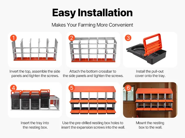 Easy to Install: Mounted with screws, nuts and other accessories, every person can easily install the egg laying box, making the setup easy to complete. It greatly saving setup time and labor costs. Its convenient design makes collecting eggs easy and avoids eggs from breaking. Enjoy an easy and convenient farming time!
