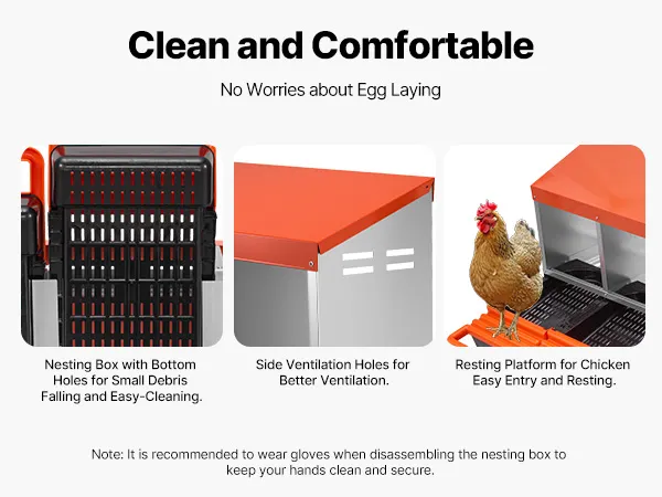 Nesting box is equipped with removable laying box design, which is easy and efficient to clean. It has spacious and comfortable roosting space, providing a clean and comfortable environment for chickens. It also improves the health and egg quality of chickens.