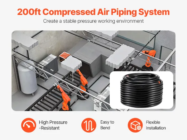 Drielaagse duurzaamheid: onze 200ft x 3/4" / 60,96 m x 19,05 mm luchtcompressorlijnset is ontworpen met een duurzame drielaagse HDPE aluminium HDPE-structuur, die uitstekende corrosie- en scheurweerstand biedt, evenals de sterkte om hoge drukken te weerstaan. Het zorgt voor een betrouwbare en efficiënte luchtstroom, perfect voor gebruik in uw fabriek en werkplaats.