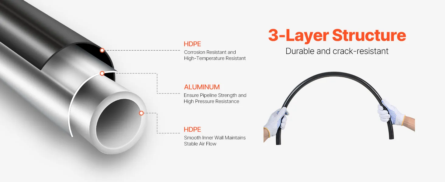 Deze luchtcompressorleidingset is gemaakt van een stevige drielaagse HDPE-aluminium-HDPE-structuur en biedt uitzonderlijke corrosieweerstand, verbeterde duurzaamheid en het vermogen om hoge druk te weerstaan.