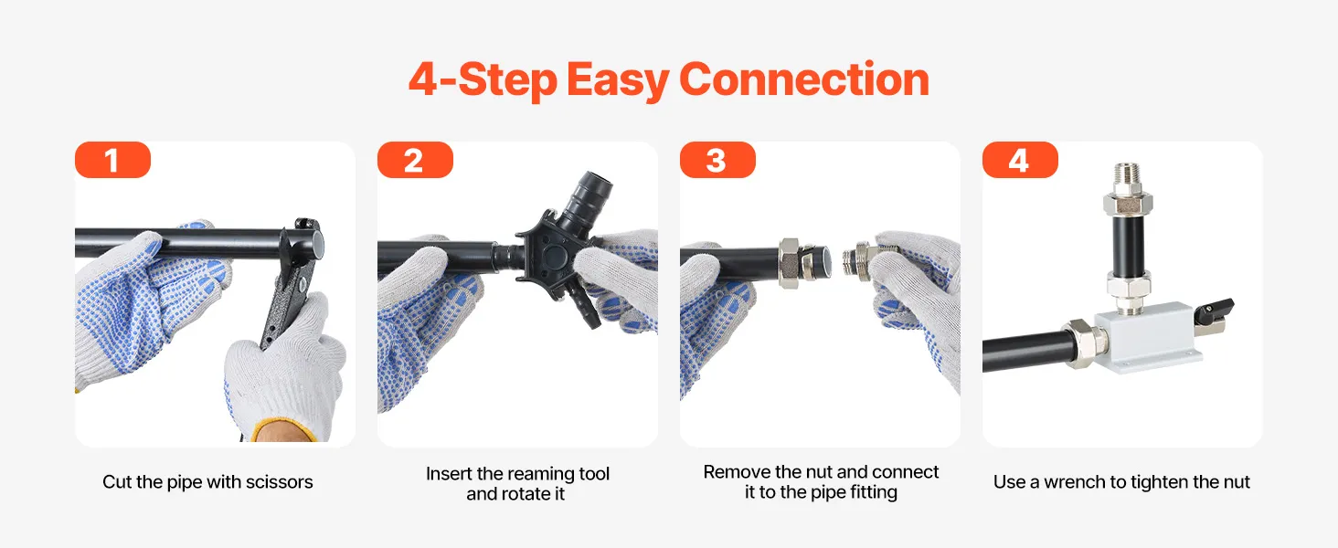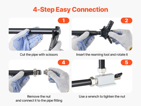 Onze HDPE aluminium kanaalsysteemkit bevat al het gereedschap dat u nodig heeft voor de installatie. Volg eenvoudigweg de duidelijke instructies om uw volledige persluchtsysteem in te stellen - geen extra gereedschap of aankopen vereist.