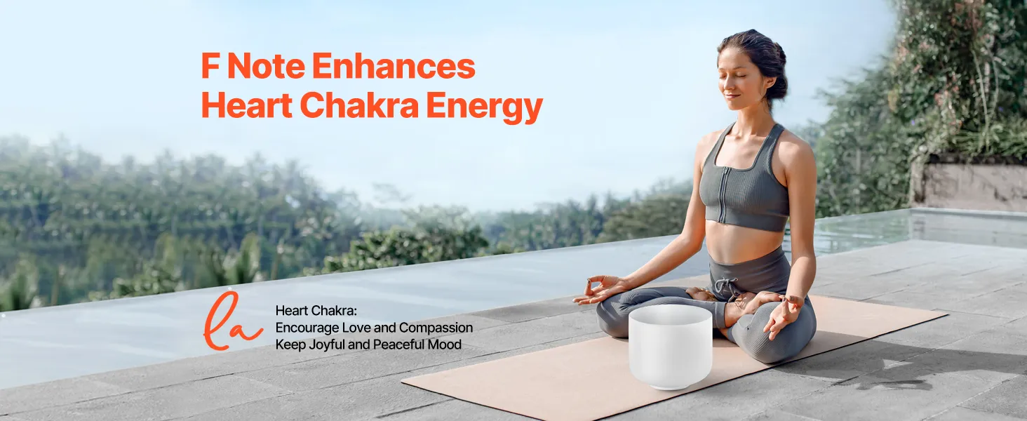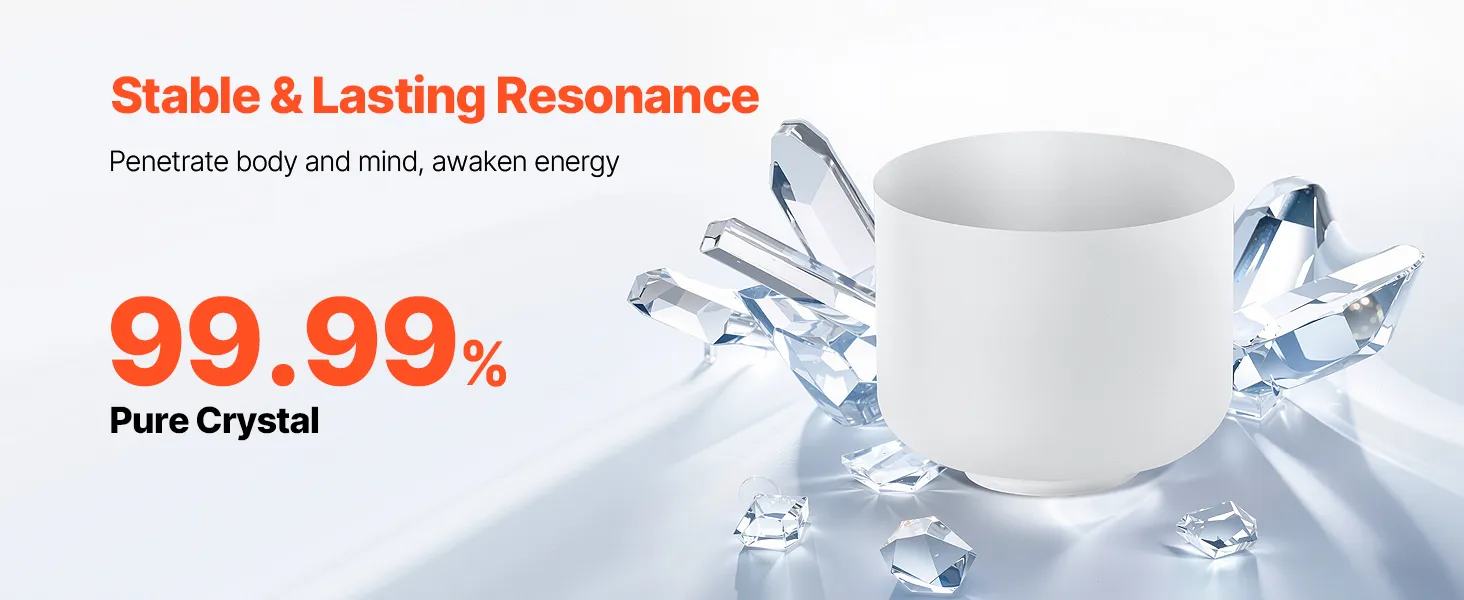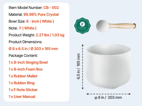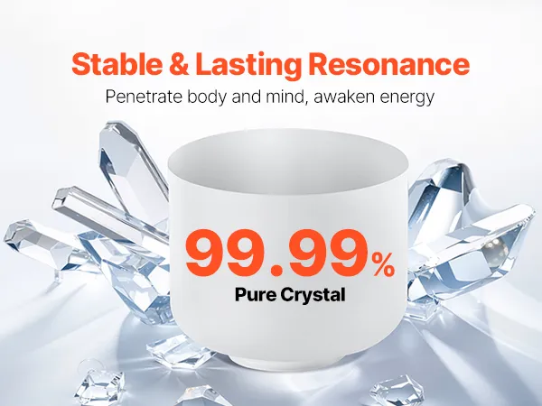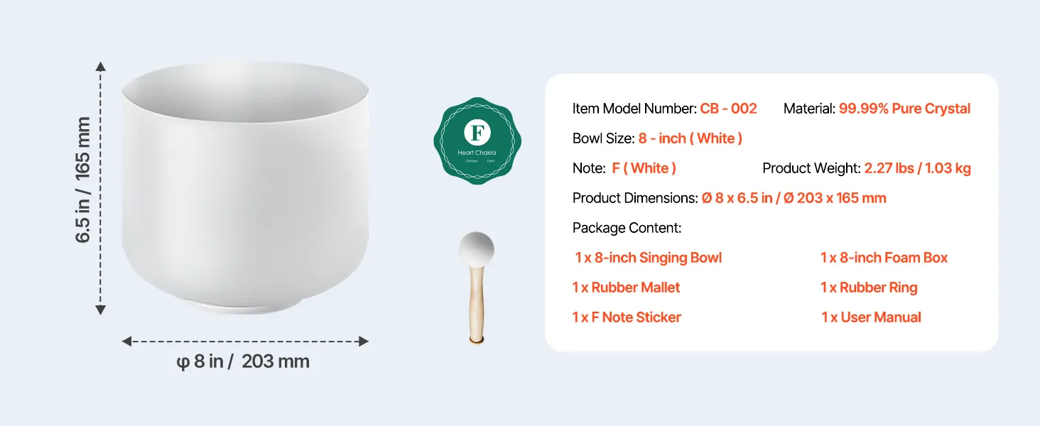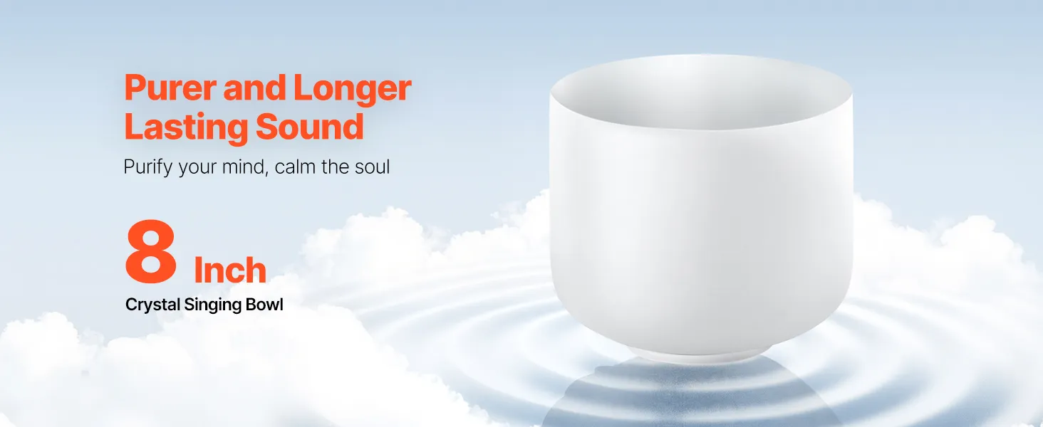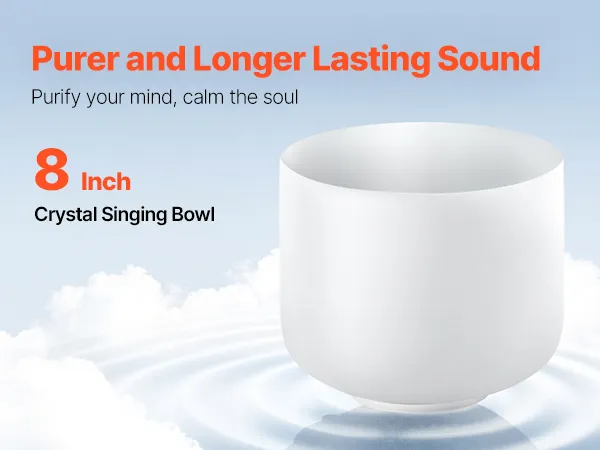 VEVOR 8-inch crystal singing bowl resonates with the F note to balance your heart chakra and soothe your mind. Made with 99.99% pure crystal, its clear tones and lasting resonance make it the ideal companion for yoga, meditation, and relaxation. Let its sound waves guide you to tranquility.