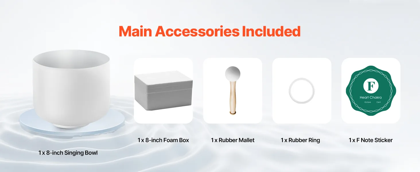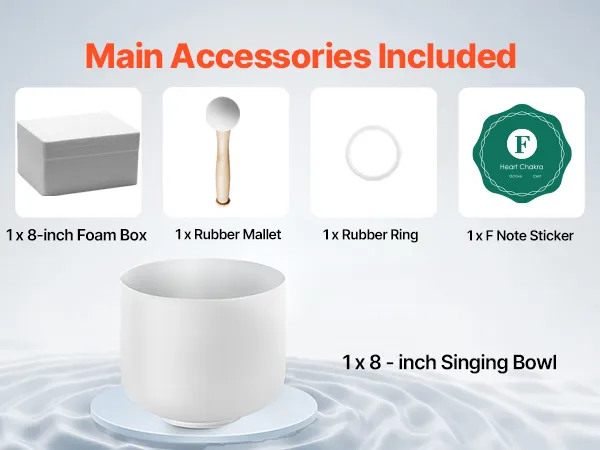 All-in-One Package: This set includes 1 x 8-inch Singing Bowl, 1 x Rubber Mallet, 1 x Rubber Ring, 1 x F Note Sticker, and 1 x Foam Box. Lightweight and portable, whether at home or on the go, you can effortlessly enjoy the soothing and healing experience brought by the singing bowl.