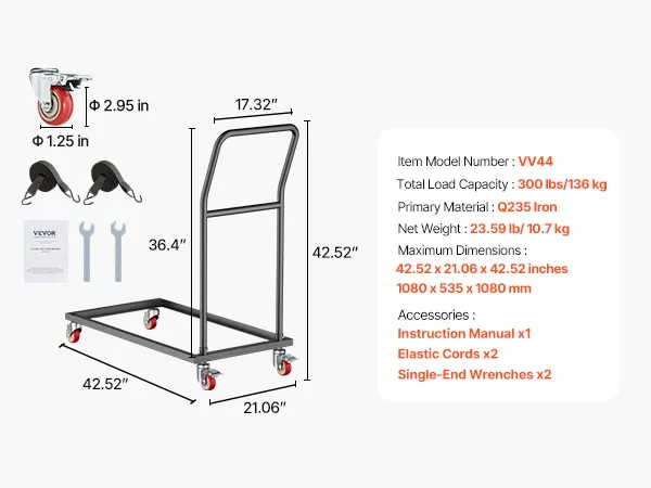 Deze stoelenwagen wordt geleverd met een complete set veelzijdige accessoires, waaronder verstelbare banden en gebruiksvriendelijke remwielen, zodat u uw stoelen soepel kunt vervoeren en veilig kunt opbergen.