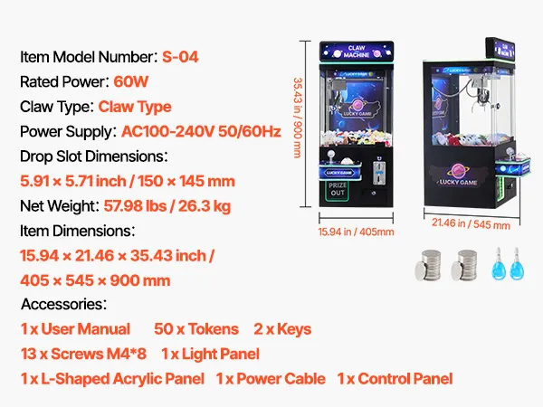 Eenvoudig onderhoud: Inclusief twee sleutels voor gemakkelijke toegang tot de munten en interne onderdelen. Deze grijpmachine garandeert een betrouwbare werking en langdurig speelplezier, zowel voor privé- als commercieel gebruik.