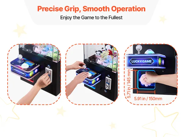Verstelbare stalen grijper: Deze grijpmachine is voorzien van een sterke stalen grijper met een verstelbare handgreep voor speelgoed van 40 tot 80 mm. Geniet van nauwkeurige grip en arcadeplezier waarbij succes afhangt van zowel de kracht van de grijper als jouw vaardigheid.