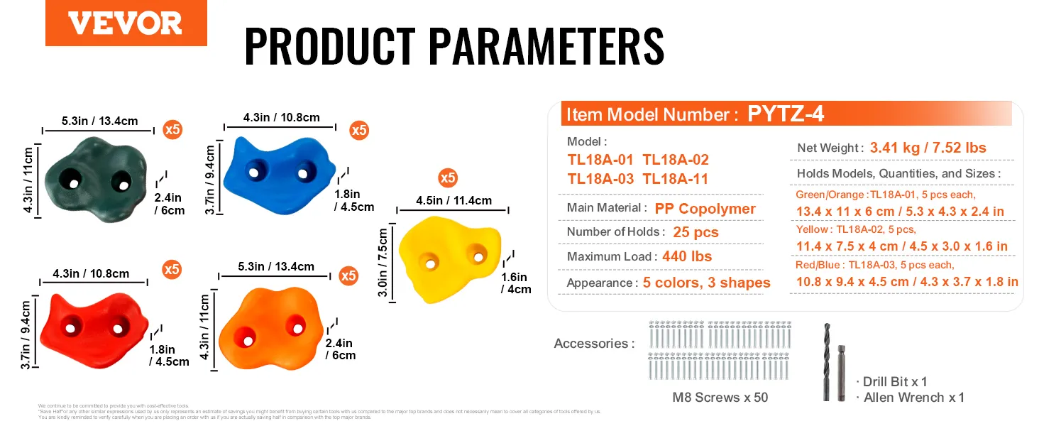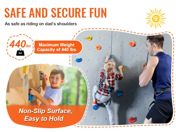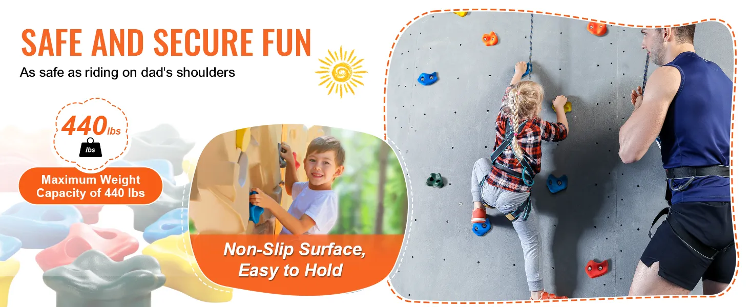 Veilig, duurzaam en stabiel: onze klimgrepen zijn gemaakt van hoogwaardig PP-copolymeer en zijn duurzaam en slijtvast. Met de meegeleverde hardware en schroeven zijn deze handgrepen ongelooflijk stevig en bestand tegen gewichten tot 200 kg (440 lbs) voor kinderen en volwassenen. De weerbestendige handgrepen zorgen voor een betrouwbare grip, voorkomen uitglijden en zorgen ervoor dat de klimmer zich net zo veilig voelt alsof hij op de schouders van zijn vader zit.