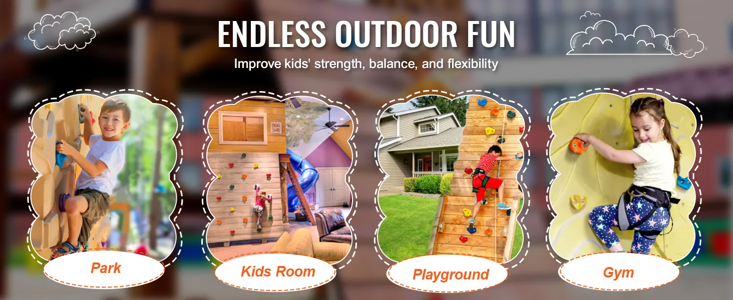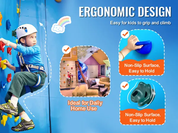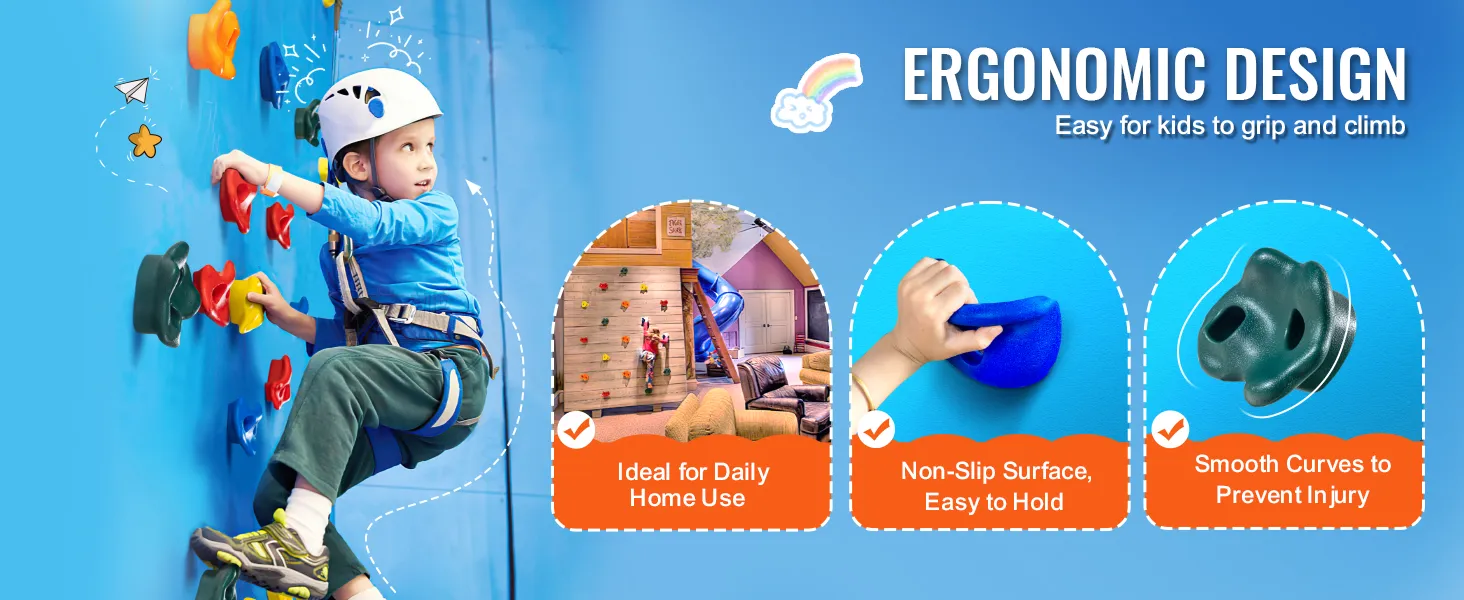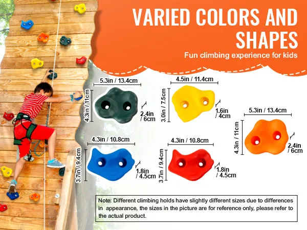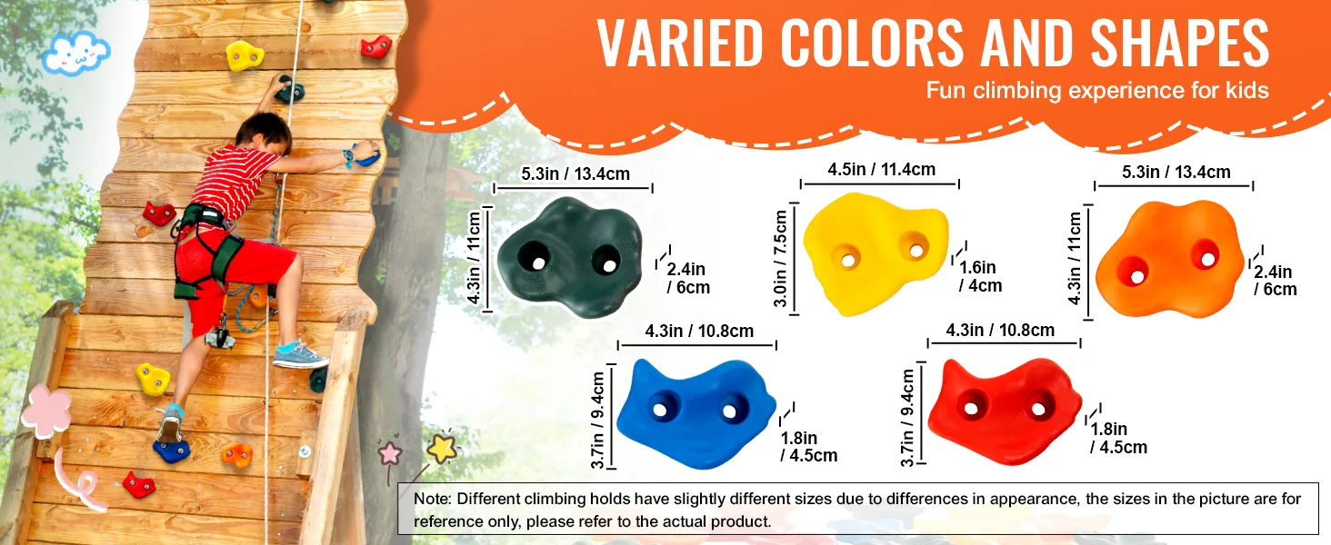 Grote en gemakkelijk vast te pakken handgrepen: De klimwandhandgrepen zijn verkrijgbaar in verschillende maten. Dankzij hun unieke antislip, gestructureerde oppervlak zijn ze gemakkelijk vast te pakken en te belopen, waardoor kinderen een veilige en comfortabele grip hebben tijdens het klimmen. Deze activiteit helpt de hand-oog-voetcoördinatie van kinderen te verbeteren, hun evenwichtsgevoel te trainen, hun concentratie te vergroten en hun zelfvertrouwen en moed te versterken.
