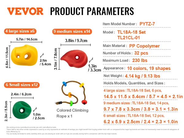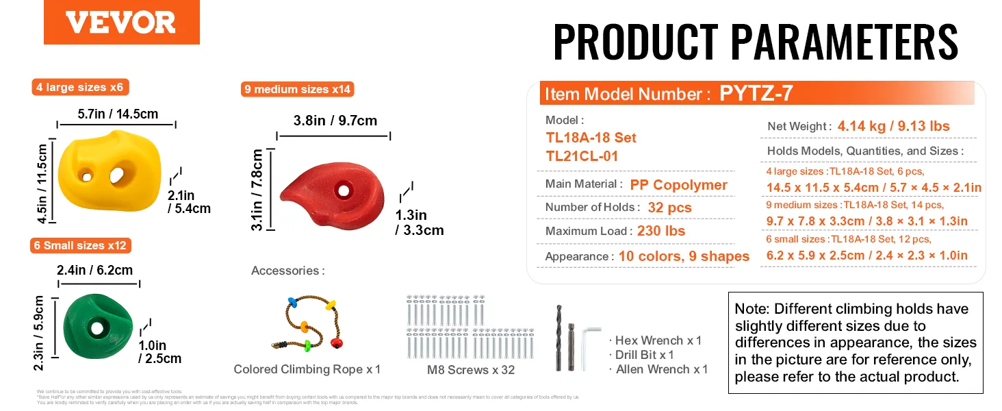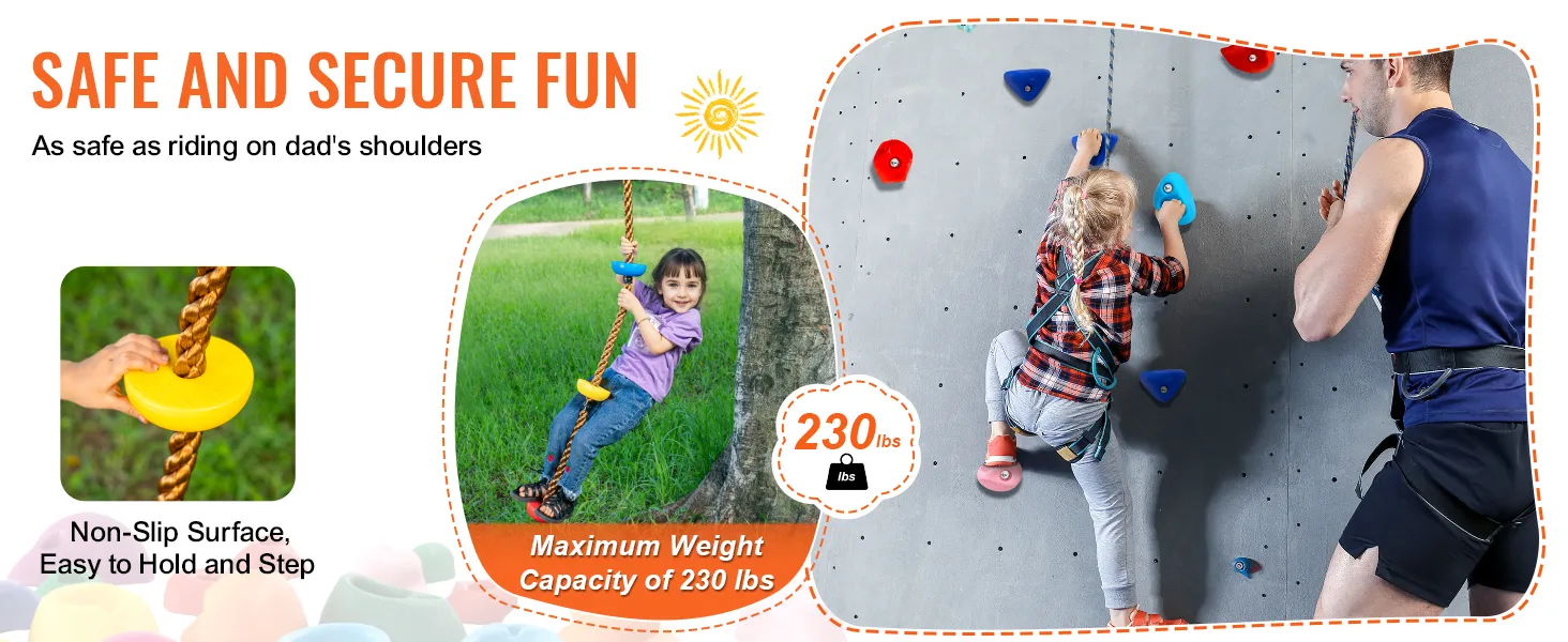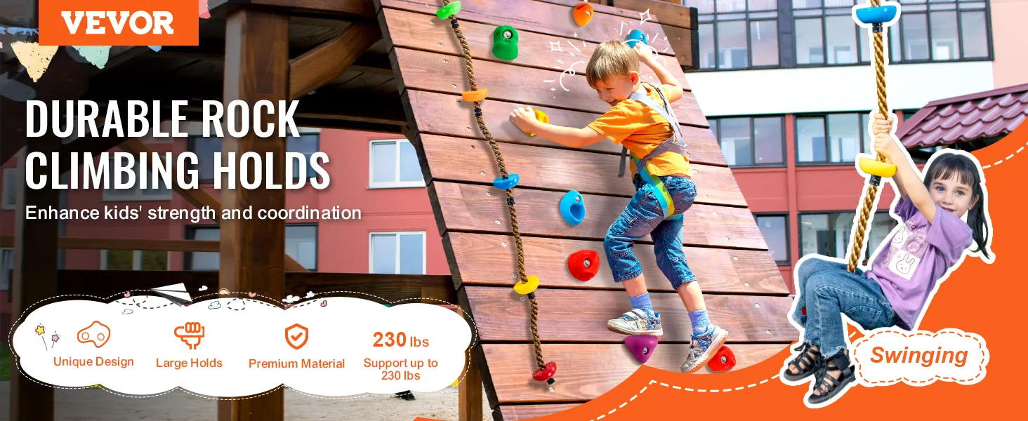 VEVOR Rock Climbing Holds zijn gemaakt van hoogwaardig PP-copolymeer. Dit maakt ze duurzaam en slijtvast. De meegeleverde hardware en schroeven zorgen ervoor dat deze grepen stevig zijn en tot 220 lbs ondersteunen. Het is duurzaam voor zowel kinderen als volwassenen. Ze bieden duurzaamheid en stabiliteit, waardoor ze betrouwbaar zijn voor kinderen en volwassenen. Weerbestendig materiaal zorgt er ook voor dat de grepen sterk en veilig blijven in de loop van de tijd, wat zorgt voor een veilige klimervaring.