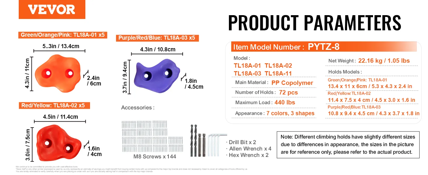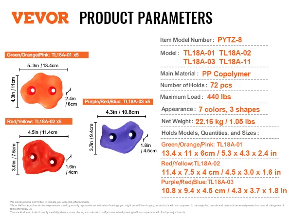 Dit maakt deze rotsklimgrepen een kosteneffectieve optie. Geniet jarenlang van de duurzaamheid en betrouwbaarheid van VEVOR klimgrepen! Gemaakt van hoogwaardig PP-copolymeer, ze zijn bestand tegen slijtage. Ze zijn ook weerbestendig, waardoor ze ideaal zijn voor gebruik buitenshuis. Regen, zon of sneeuw beschadigen deze grepen niet. Dit zorgt ervoor dat ze hun levendige kleuren en grip behouden. U hoeft ze niet vaak te vervangen, wat ze een betaalbare keuze maakt.