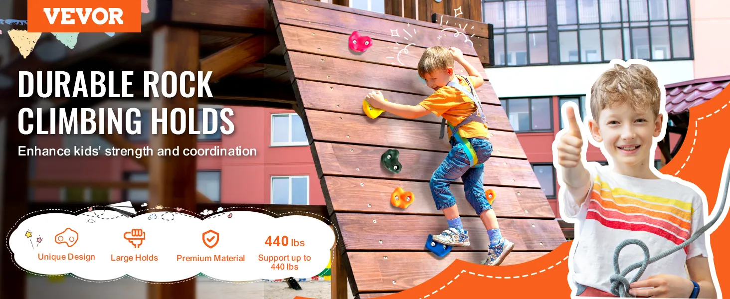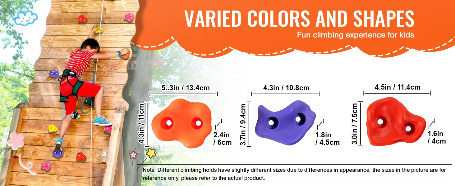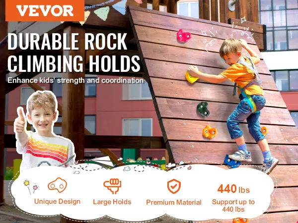 De VEVOR klimgrepen zijn verkrijgbaar in felle kleuren en verschillende vormen. Deze kleurrijke kenmerken trekken de aandacht van kinderen. Kinderen die willen klimmen en spelen, zullen erdoor aangetrokken worden. Dit kan helpen de schermtijd te verminderen terwijl ze actief spelen. De verschillende vormen maken klimmen interessanter en uitdagender. Kinderen zullen het geweldig vinden om nieuwe routes en grepen te ontdekken. Deze kleurrijke grepen veranderen elke ruimte in een leuke speeltuin.