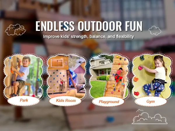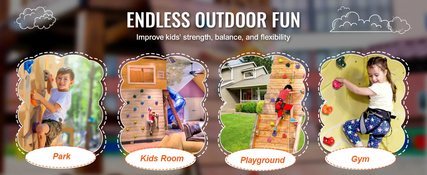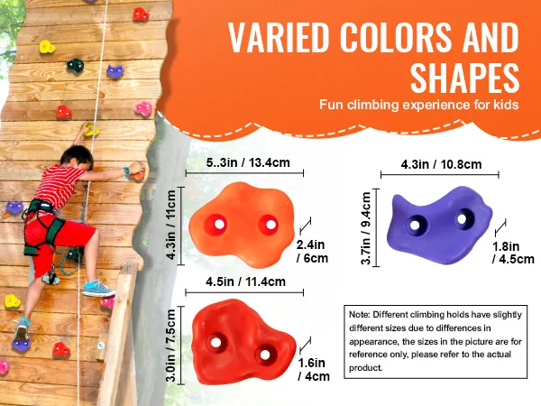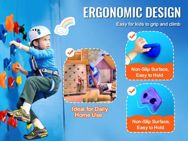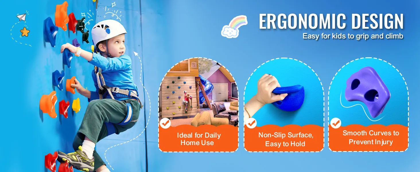 Grote en gemakkelijk vast te pakken handgrepen: De klimwandhandgrepen zijn verkrijgbaar in verschillende maten. Dankzij hun unieke antislip, gestructureerde oppervlak zijn ze gemakkelijk vast te pakken en te belopen, waardoor kinderen een veilige en comfortabele grip hebben tijdens het klimmen. Deze activiteit helpt de hand-oog-voetcoördinatie van kinderen te verbeteren, hun evenwichtsgevoel te trainen, hun concentratie te vergroten en hun zelfvertrouwen en moed te versterken.