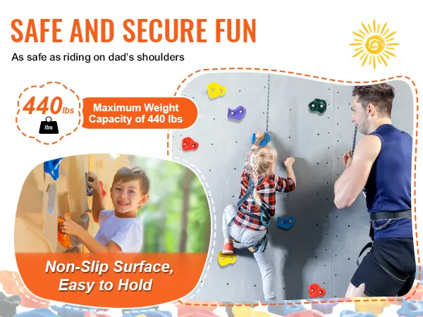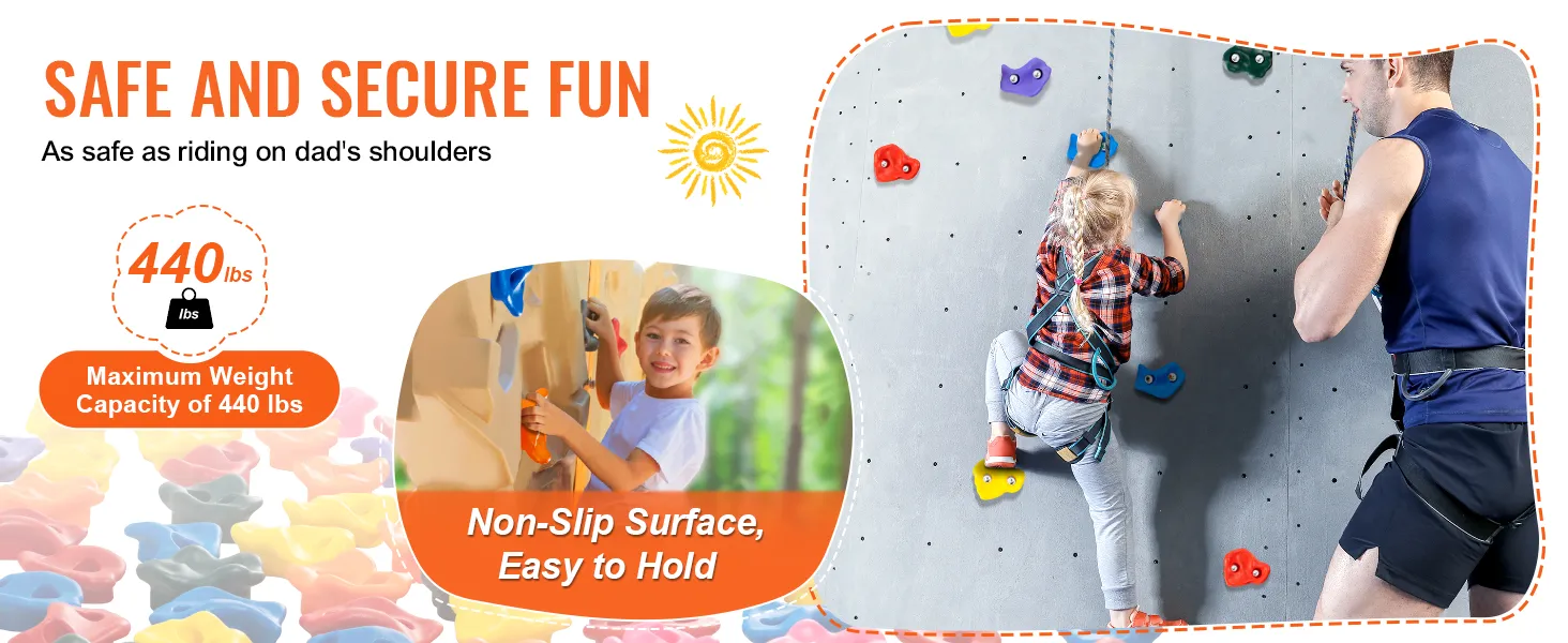 Veilig, duurzaam en stabiel: onze klimgrepen zijn gemaakt van hoogwaardig PP-copolymeer en zijn duurzaam en slijtvast. Met de meegeleverde hardware en schroeven zijn deze handgrepen ongelooflijk stevig en bestand tegen gewichten tot 200 kg (440 lbs) voor kinderen en volwassenen. De weerbestendige stenen bieden betrouwbare ondersteuning, voorkomen uitglijden en geven klimmers het veilige gevoel op de schouders van hun vader te zitten.