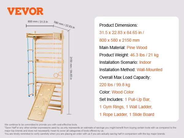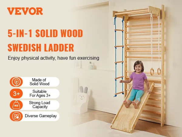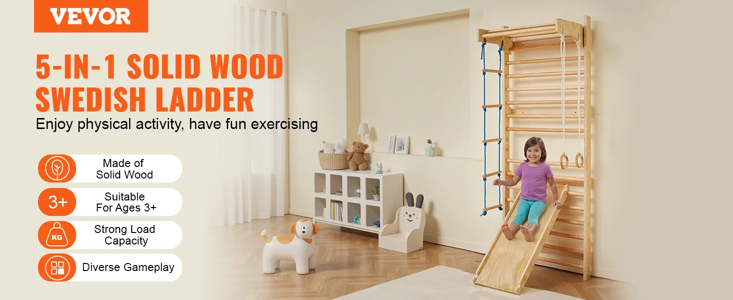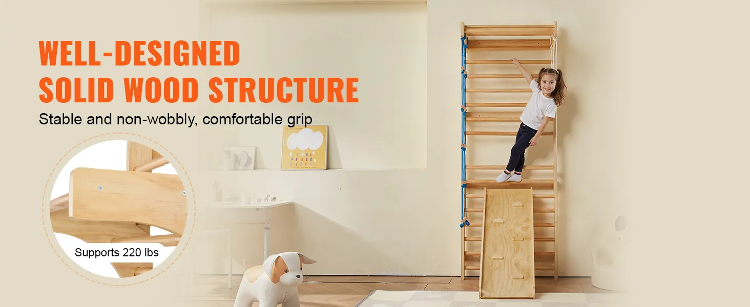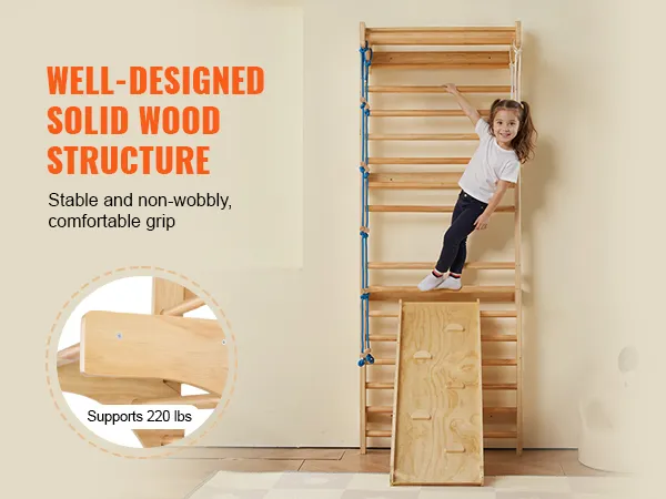 Onze Zweedse muurladder heeft een uitgebalanceerde structuur voor stabiliteit en veiligheid. De handgreep zorgt voor comfortabel gebruik en een draagvermogen tot 99,8 kg. Het is CE- en CPC-gecertificeerd en garandeert plezier en veiligheid voor klimmers van alle leeftijden.