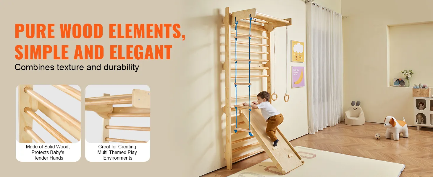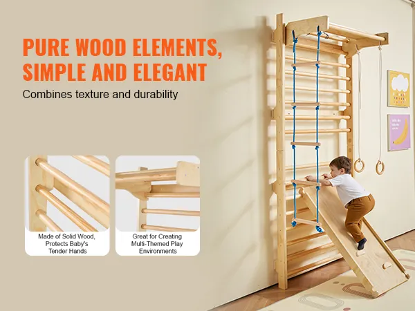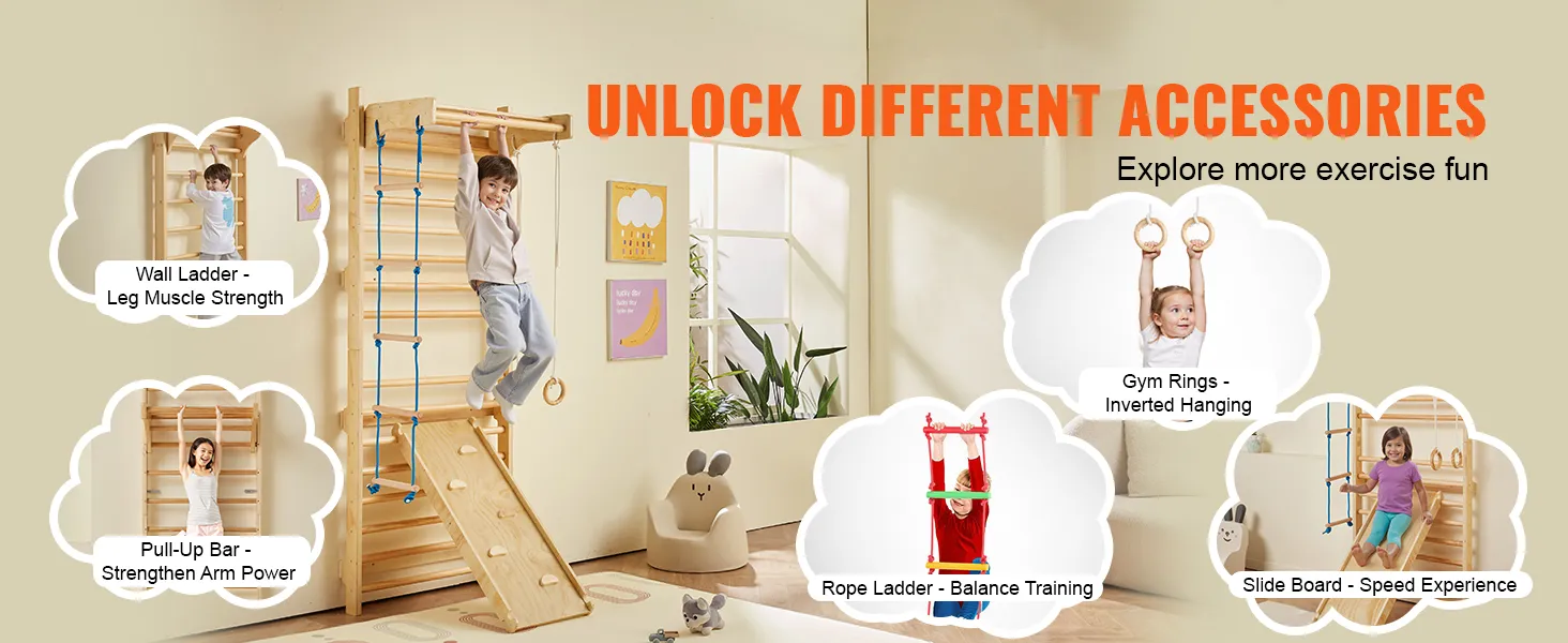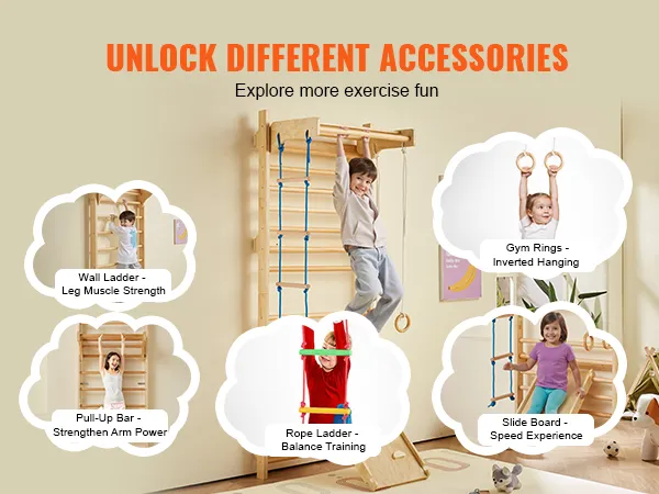 Kinderen kunnen ladderklimmen, touwladderklimmen en gymnastiekringen proberen om hun coördinatievaardigheden te verbeteren. Dit Zweedse wandturntoestel biedt diverse klimmogelijkheden en bevordert het fysieke uithoudingsvermogen.