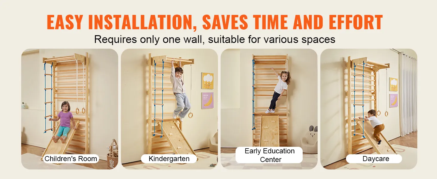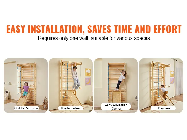 Eenvoudige installatie: Onze Zweedse muur is eenvoudig en snel te installeren dankzij gedetailleerde installatie-instructies. Hij kan in kinderkamers, kleuterscholen of kleuterscholen worden geplaatst en is daarom veelzijdig inzetbaar voor verschillende ruimtes.