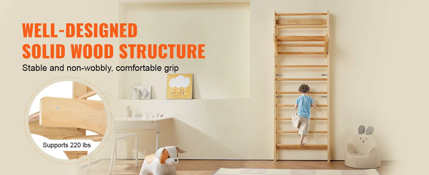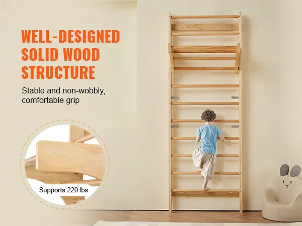Our Swedish wall ladder is designed with a well-balanced structure for stability and security. The grip makes it comfortable to use, with a weight capacity of up to 220 lbs.It is CE and CPC certified, ensuring it's not only fun but also secure for climbers of different ages.