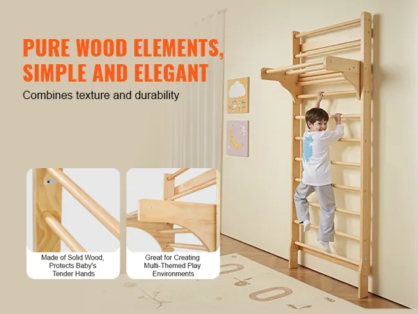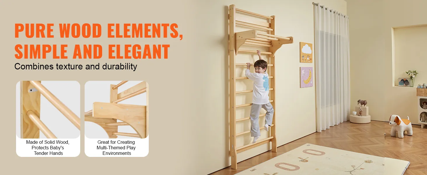 Secure Solid Wood Design: Our Swedish wall ladder is crafted from thick, solid wood with no splinters. All edges are rounded for safety, giving you peace of mind while your child climbs and explores.